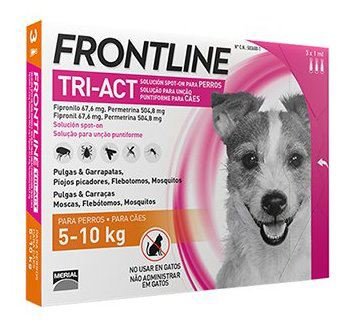 Características de Frontline Tri-act 5-10 KgFormula con una triple acción: repele, elimina y protege.Solamente necesita 1 aplicación al mes. Actúa frente a 5 grupos de ectoparásitos de los perros: flebotomos, mosquitos, moscas de los establos, pulgas y garrapatasEficacia insuperable: consigue eliminar el 99% de pulgas del perro y repeler el 90% de flebótomos del entorno del perro.Eficacia repelente frente a flebotomos (Phlebotomus perniciosus), mosquitos (Culex pipiens) y moscas de los establos (Stomoxys calcitrans).Reduce el riesgo del perro de transmisión de enfermedades por mosquitos.El producto puede utilizarse en cachorros a partir de las 8 semanas de edad y con un peso mínimo de 2 kg.